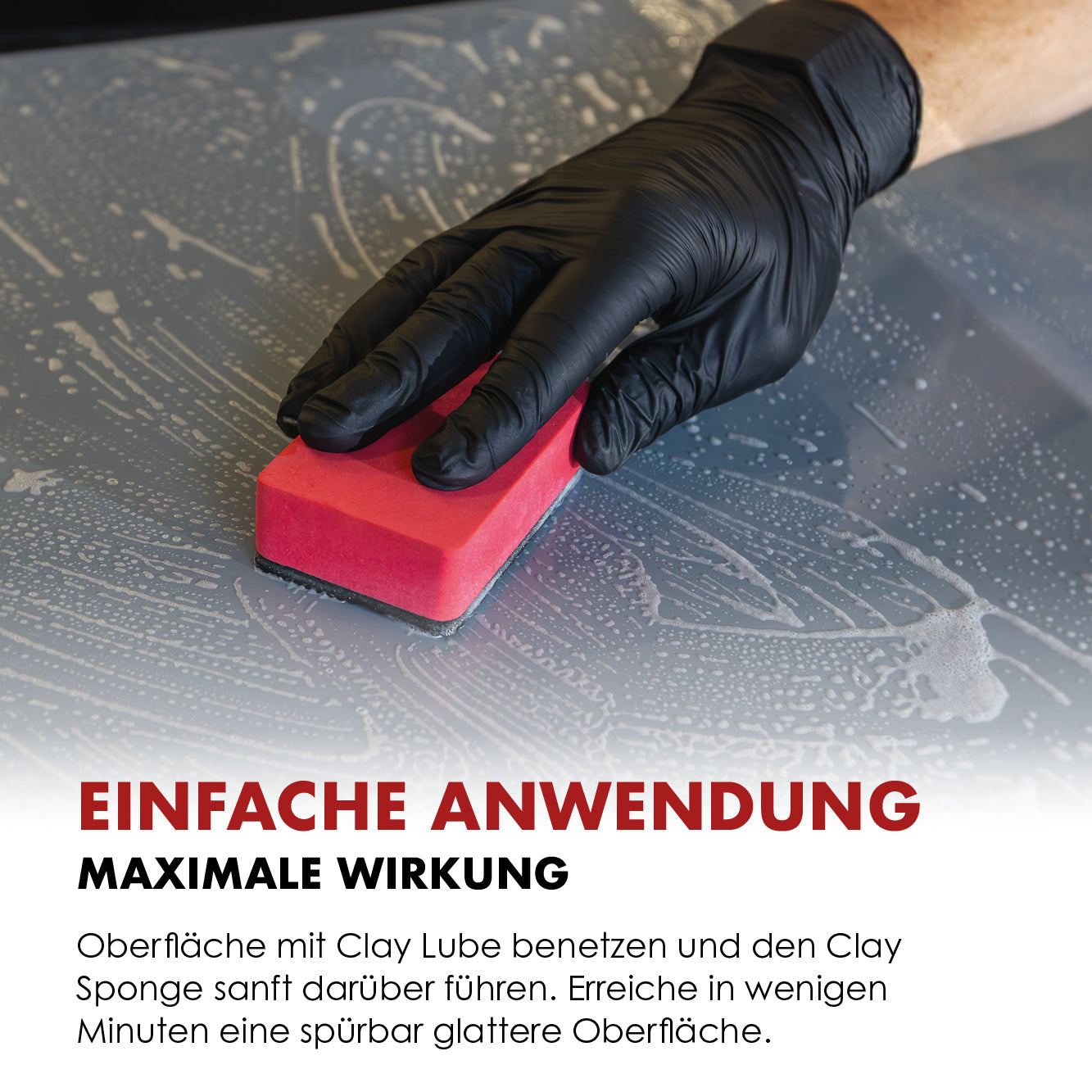 Simply wet the surface with Clay Lube or water and gently move the Clay Sponge over paint, glass, or plastic. This way, you can effortlessly remove even stubborn residues – in just a few minutes and without any effort.