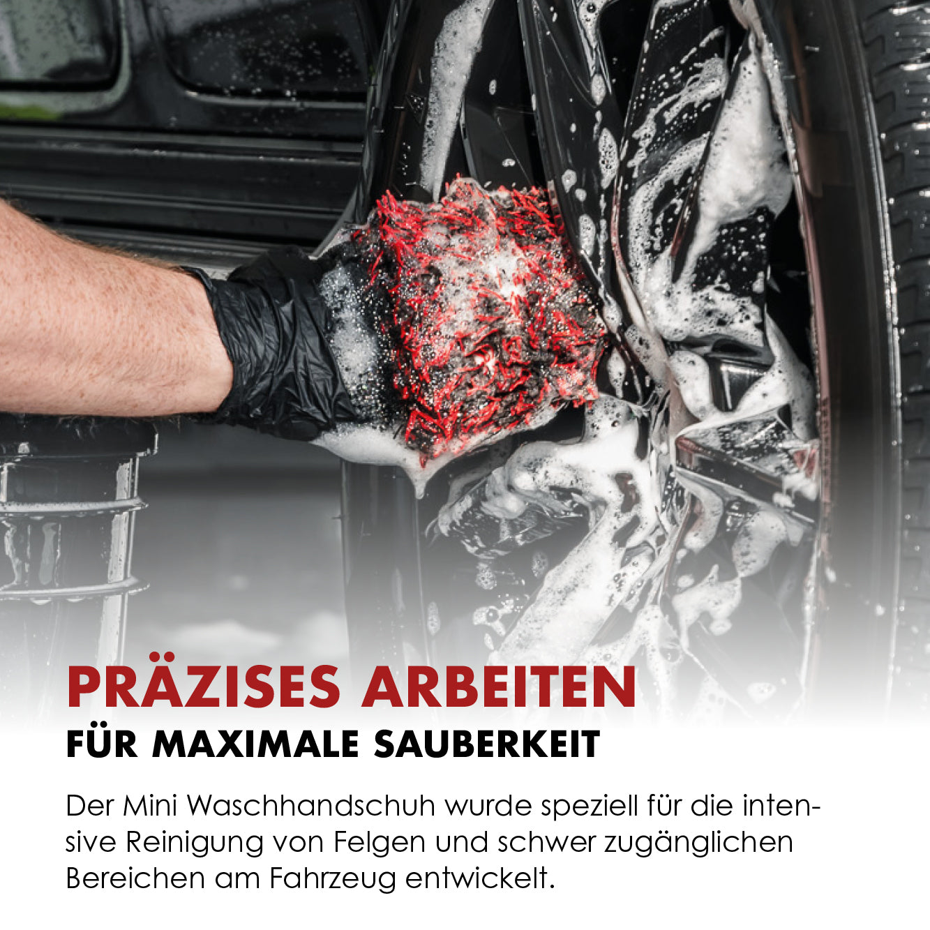 Mini rękawica do mycia felg została zaprojektowana specjalnie do jeszcze dokładniejszego i bardziej precyzyjnego czyszczenia felg – nawet tam, gdzie tradycyjne szczotki czy duże rękawice nie docierają. Dzięki bezpośredniemu kontaktowi z powierzchnią masz pełną kontrolę nad każdym ruchem i z łatwością docierasz do wąskich szprych, zagłębień i krawędzi.