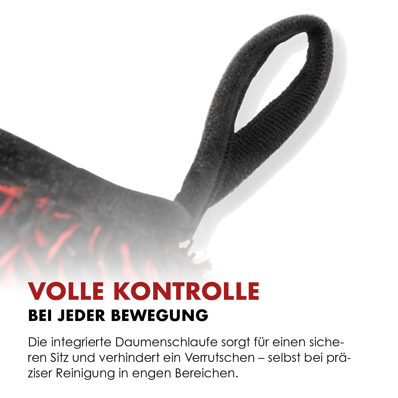 Wysokiej jakości, długie mikrowłókna skutecznie, a jednocześnie bardzo delikatnie czyszczą – idealne do wrażliwych powierzchni felg. Zintegrowana pętla na kciuk zapewnia pewny chwyt, nawet przy mokrych dłoniach lub precyzyjnej pracy.