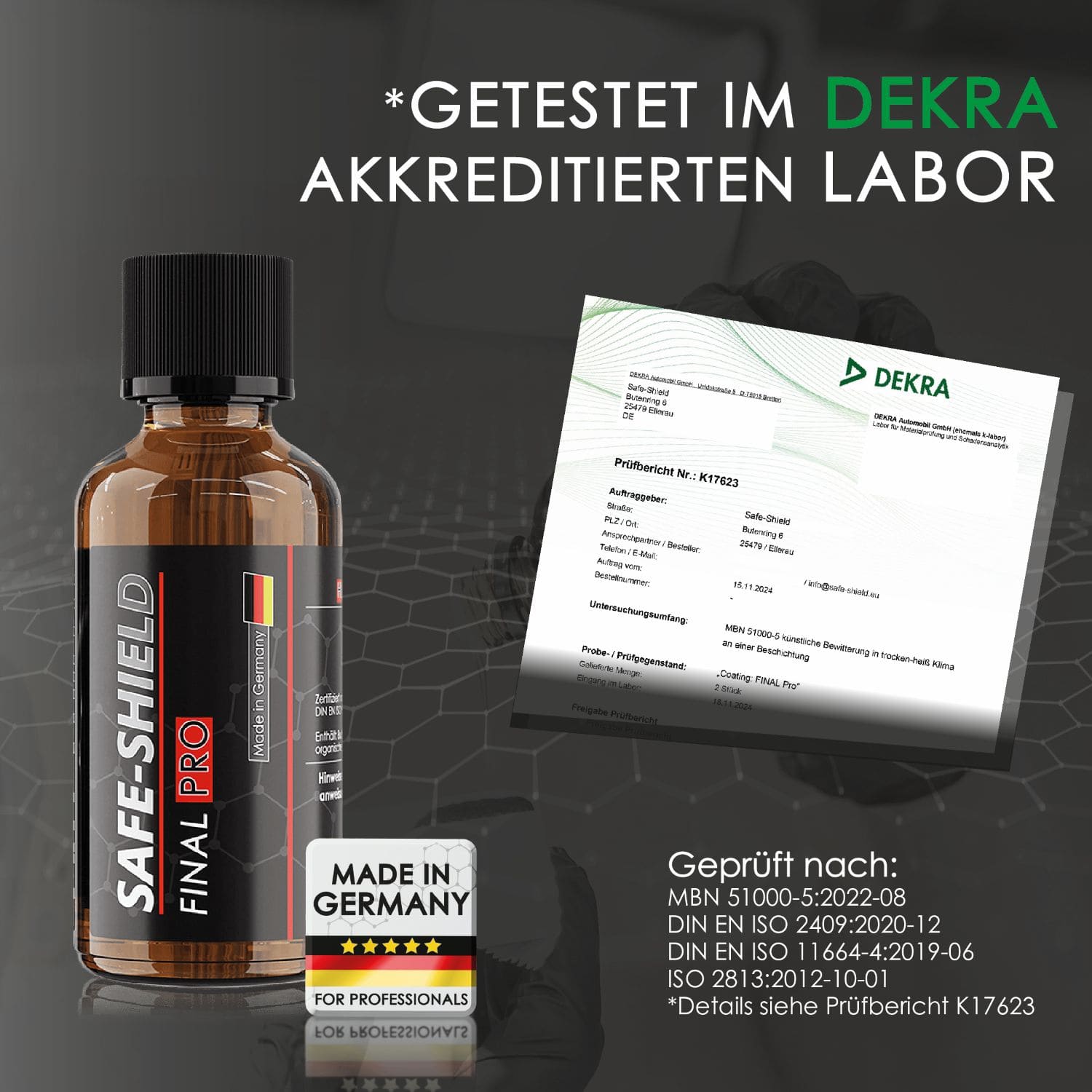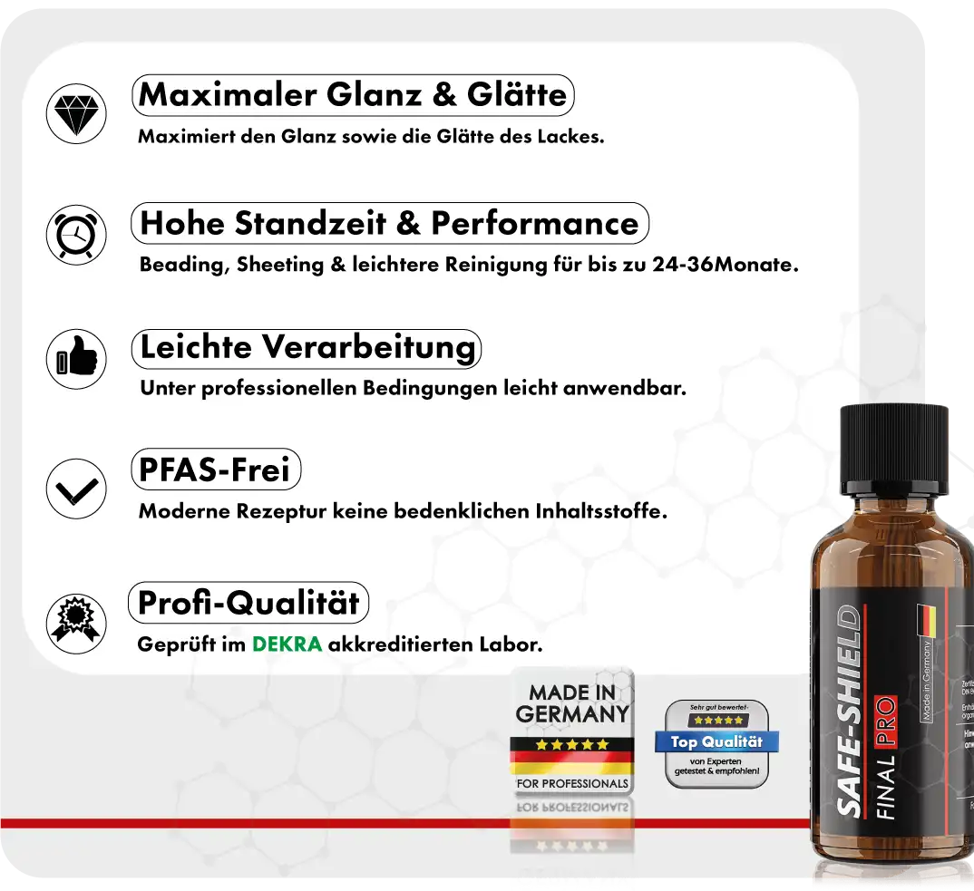 Nasza powłoka ceramiczna Final Pro jest opracowywana, produkowana i testowana w Niemczech. Spełnia wszystkie aktualne normy i jednocześnie oferuje maksymalną wydajność bez kompromisów.
